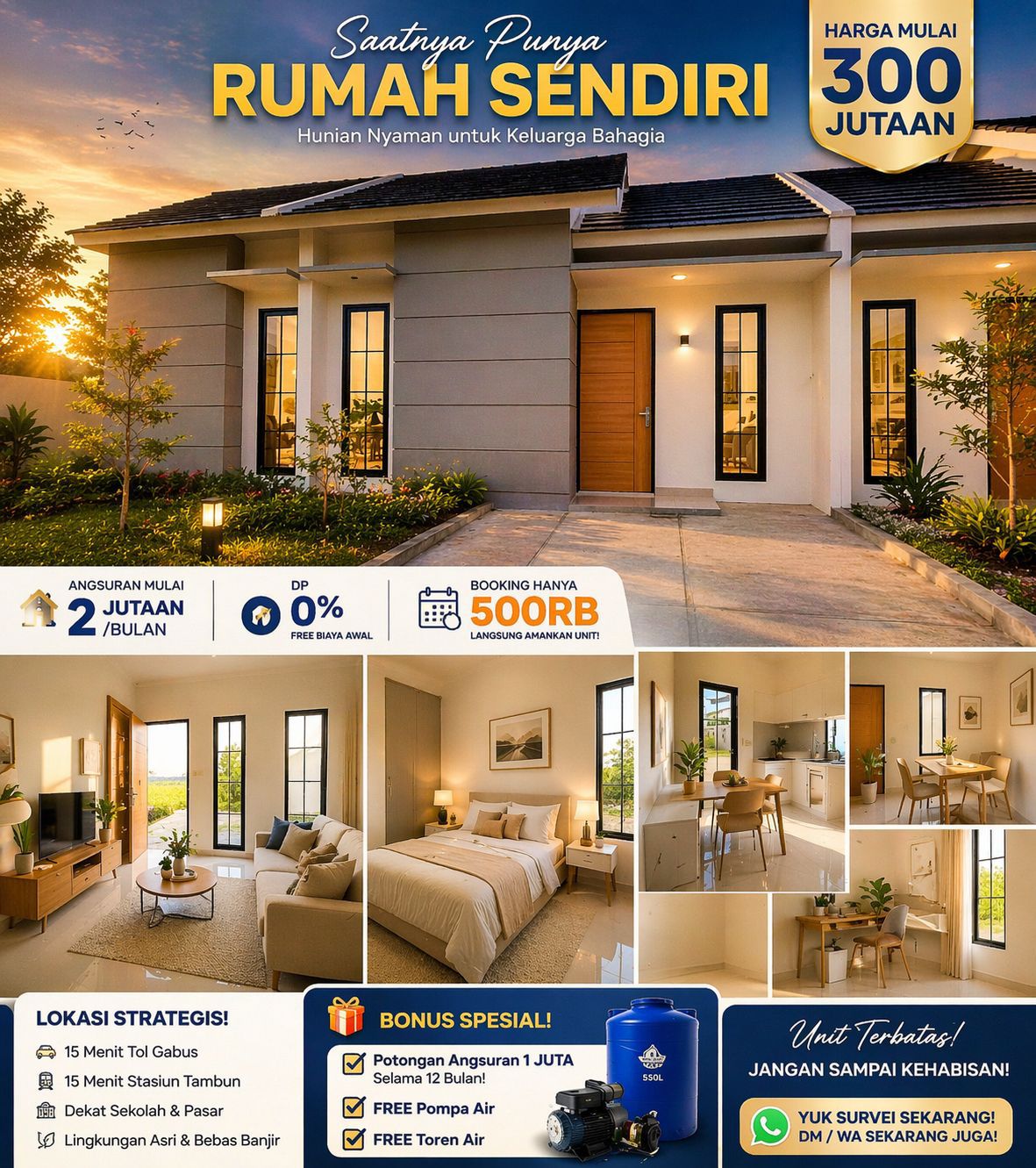 Pilih berbagai properti sesuai kebutuhan Anda, mulai dari rumah subsidi hingga rumah komersial. Tersedia pilihan DP mulai 0%, tenor fleksibel hingga 20 tahun, serta cicilan tetap (flat) sampai lunas sehingga lebih tenang dan mudah direncanakan. Tim kami siap membantu Anda dari proses konsultasi hingga akad.